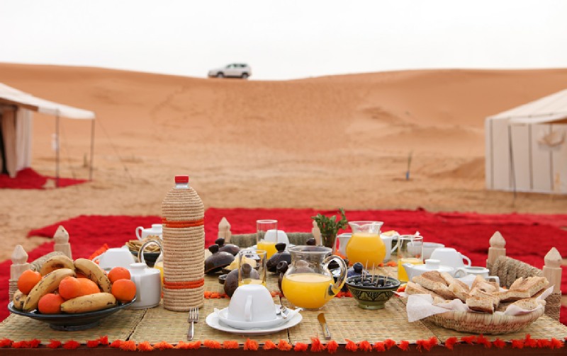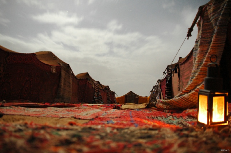 Después de ver el atardecer Merzouga, nuestra cena será servida cerca del campamento y escuchamos música beréber. Pasa la noche en las tiendas del desierto de Merzouga.