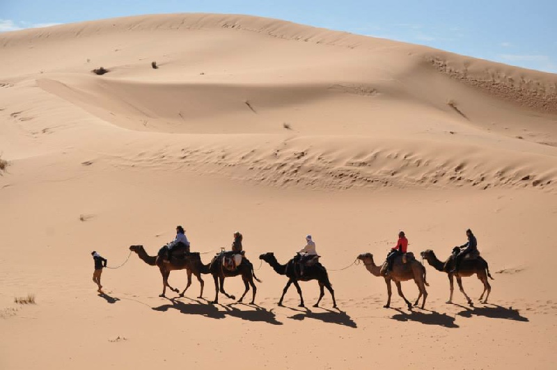 Visita guiada en el desierto con guía local. Exploramos el desierto en 4 × 4. Visitamos Khamlia, Hassilabiad y Rissani. Después te preparas para una caminata en camello a las dunas de Merzouga y nos quedamos en el campamento del desierto durante la noche.